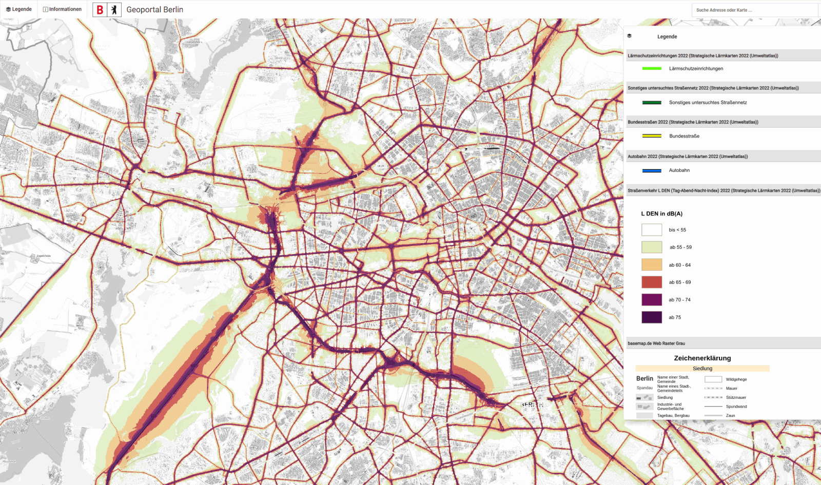 Die „Strategischen Lärmkarten 2022“ wurden nach dem EU-weit einheitlichen Rechenmodell CNOSSOS-EU erstellt. Dieses Modell bildet die physikalische Lärmentstehung (Reifen-Fahrbahn-Geräusche, Motorlast etc.) detaillierter ab als frühere Verfahren. Die Karten dienen als gesetzliche Grundlage für den Lärmaktionsplan Berlin. Der L DEN (Tag-Abend-Nacht-Lärmindex) gewichtet Abendstunden (+5 dB) und Nachtstunden (+10 dB) stärker, um die höhere Störwirkung in diesen Zeiten abzubilden. Der L N Nachtindex betrachtet ausschließlich den Zeitraum von 22:00 bis 06:00 Uhr.