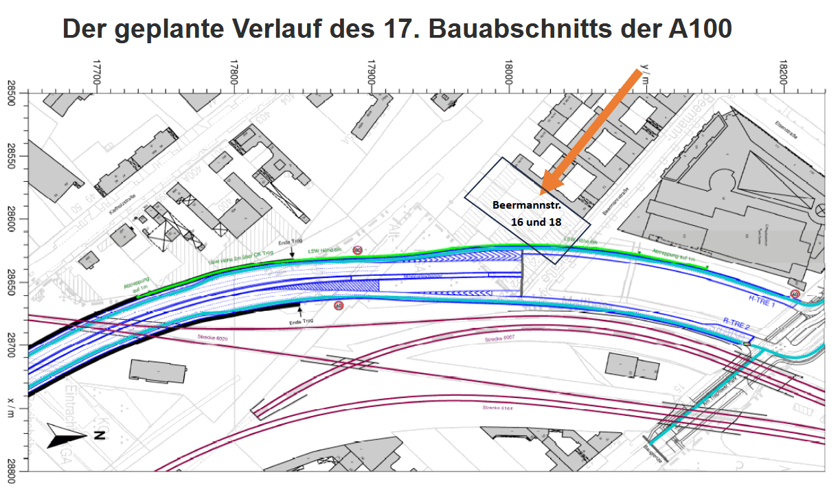 Die Häuser Beermannstraße 16 und 18 liegen mitten auf der geplanten Autobahntrasse. Besonders skandalös: Es besteht der Verdacht, dass die Grundstücke der Häuser 16 und 18 eventuell gar nicht dauerhaft für die Fahrbahnen der Autobahn selbst, sondern lediglich als temporäre Fläche für die Baustelleneinrichtung oder als Lagerplatz für Baumaterial benötigt werden. „Es ist unerträglich, dass Menschen ihr Zuhause verlieren sollen, damit dort Material gelagert werden kann“, kritisiert die neu gegründete Mieterinitiative.